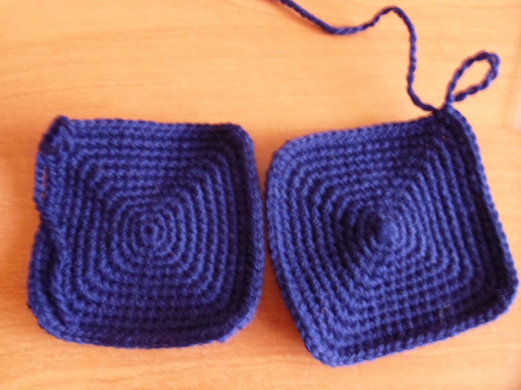 Kończąc drugi - bez odcinania wełny - od razu łączymy je ze sobą, przed zamknięciem ostatniej krawędzi wsuwamy do środka nasz kwadracik :)