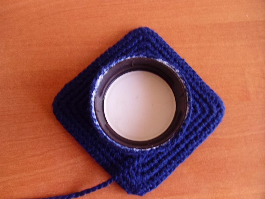 Zaczynamy od zrobienia łańcuszka, o długości obwodu słoiczka - robimy oczkami ścisłymi, od góry, gdyż słoiczki zazwyczaj rozszerzają się ku dołowi, więc łatwiej nam naciągnąć od tej strony.