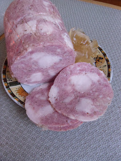 Wciąż eksperymentuję. Co prawda upały i okazyjne zaopatrzenie lodówki,  trochę spowolniło moje zapędy, ale nie ma ten tego , dalej się robi.  Dziś szyneczka z szynki wieprzowej z filetem drobiowym. Prawie dokładnie z przepisu DANUSI - Dziękuję :)  Moja wyszła tak.